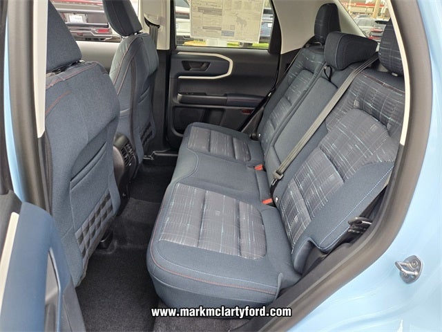 Bronco Sport Heritage, 4D Sport Utility, 1.5L EcoBoost, 8-Speed Automatic, 4WD, Robins Egg Blue, Navy Pier Cloth, 4-Wheel Disc Brakes, 6 Speakers, ABS brakes, Air Conditioning, Alloy wheels, AM/FM radio: SiriusXM, AM/FM Stereo, Auto High-beam Headlights, Automatic temperature control, Brake assist, Compass, Convenience Package, Delay-off headlights, Driver door bin, Driver vanity mirror, Dual front impact airbags, Dual front side impact airbags, Electronic Stability Control, Emergency communication system: SYNC 4 911 Assist, Equipment Group 250A, Four wheel independent suspension, Front anti-roll bar, Front Bucket Seats, Front Center Armrest, Front Driver/Passenger Seat Back Map Pockets, Front License Plate Bracket, Front reading lights, Fully automatic headlights, Heated 8-Way Power Driver's Seat, Heated door mirrors, Illuminated entry, Knee airbag, LED Fog Lamps, Low tire pressure warning, Occupant sensing airbag, Outside temperature display, Overhead airbag, Overhead console, Panic alarm, Passenger door bin, Passenger vanity mirror, Plaid Cloth Front Bucket Seats, Power door mirrors, Power steering, Power windows, Premium Wrapped Steering Wheel, Radio data system, Rear anti-roll bar, Rear Parking Sensors, Rear reading lights, Rear seat center armrest, Rear window defroster, Rear window wiper, Remote keyless entry, Security system, SiriusXM, Speed control, Speed-sensing steering, Speed-Sensitive Wipers, Split folding rear seat, Steering wheel mounted audio controls, SYNC 4 w/Enhanced Voice Recognition, Tachometer, Telescoping steering wheel, Tilt steering wheel, Traction control, Trip computer, Universal Garage Door Opener (UGDO), Variably intermittent wipers, Wheels: 17 Oxford White-Painted Aluminum.