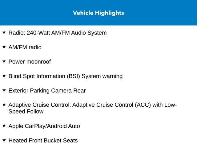 Adaptive Cruise Control: Adaptive Cruise Control (ACC) with Low-Speed Follow, AM/FM radio, Apple CarPlay/Android Auto, Blind Spot Information (BSI) System warning, Exterior Parking Camera Rear, Heated Front Bucket Seats, Power moonroof, Radio: 240-Watt AM/FM Audio System, Wheels: 18 Sparkle Silver.