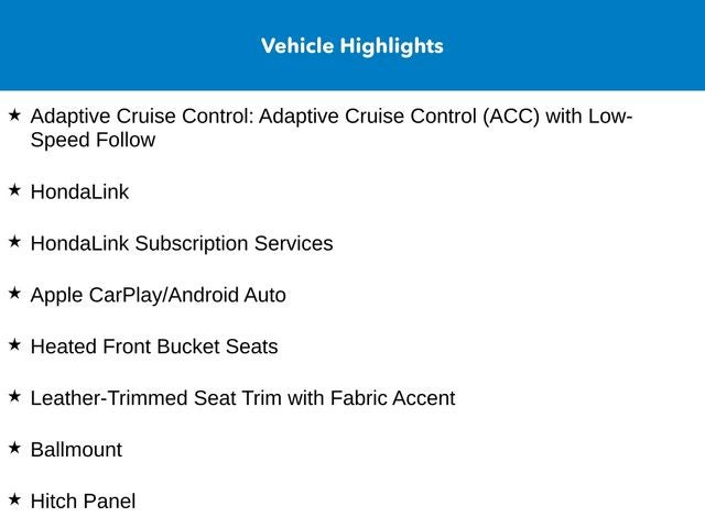 Adaptive Cruise Control: Adaptive Cruise Control (ACC) with Low-Speed Follow, Apple CarPlay/Android Auto, Ballmount, Blind Spot Information (BSI) System warning, Exterior Parking Camera Rear, Heated Front Bucket Seats, Hitch Panel, HondaLink, HondaLink Subscription Services, Lane departure: Lane Keeping Assist System (LKAS) active, Leather-Trimmed Seat Trim with Fabric Accent, Navigation system: Google Maps, Power Liftgate, Radio data system, Radio: 245-Watt Audio System, Tow Package, Trailer Hitch, Trailer Hitch Harness, Wheels: 18 Pewter Gray Machined Face.