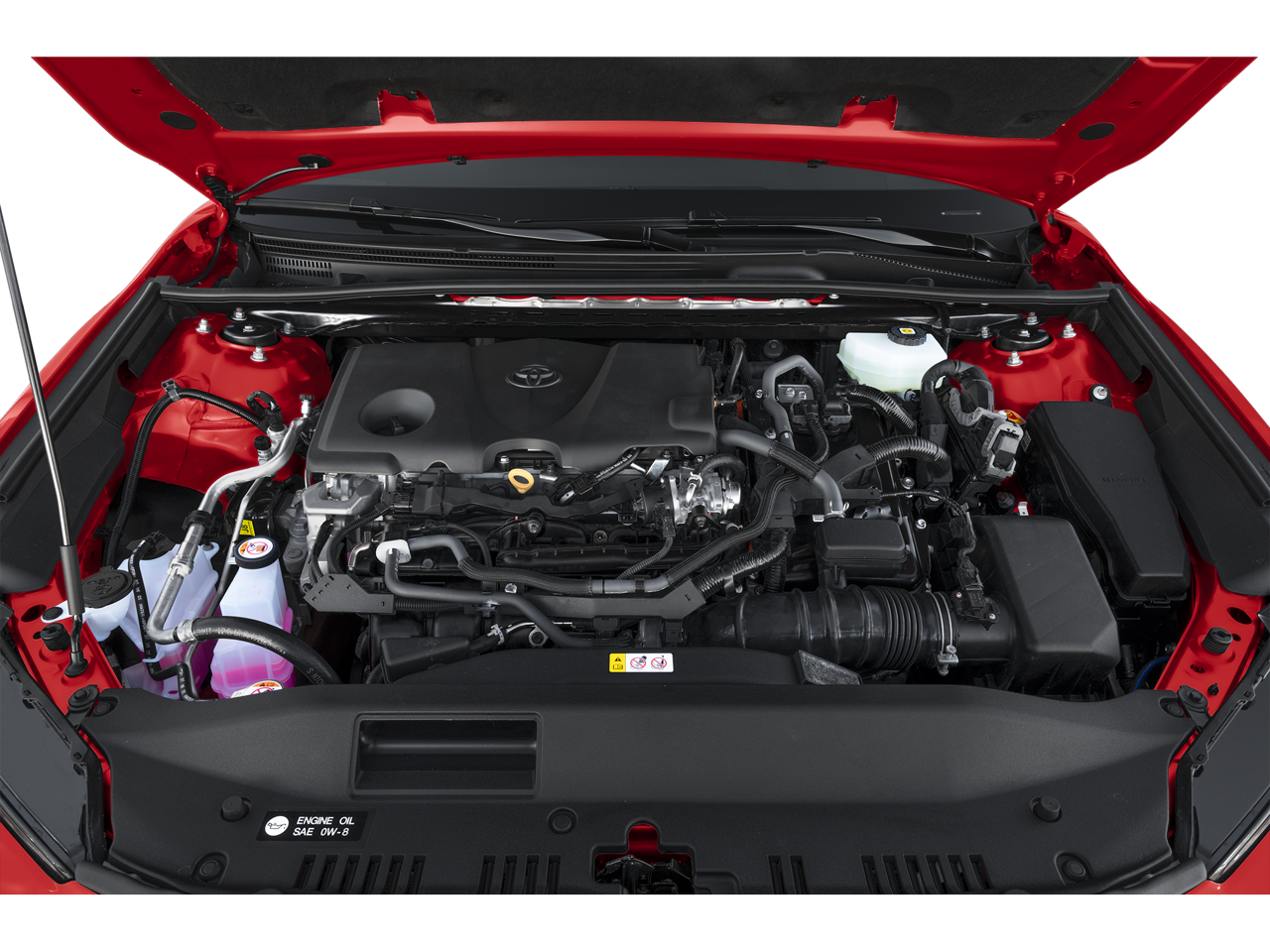 Red 2026 Toyota Camry SE Nightshade FWD eCVT 2.5L 4-Cylinder 16V DOHC 4-Wheel Disc Brakes, 6 Speakers, ABS brakes, Air Conditioning, Alloy wheels, AM/FM radio: SiriusXM, Apple CarPlay/Android Auto, Auto High-beam Headlights, Automatic temperature control, Brake assist, Bumpers: body-color, Delay-off headlights, Driver door bin, Driver vanity mirror, Dual front impact airbags, Dual front side impact airbags, Electronic Stability Control, Emergency communication system: Safety Connect (5-year trial), Exterior Parking Camera Rear, Four wheel independent suspension, Front anti-roll bar, Front Bucket Seats, Front Center Armrest, Front dual zone A/C, Front reading lights, Front Seats, Fully automatic headlights, Heated door mirrors, Heated Front Seats, Illuminated entry, Knee airbag, Leather Shift Knob, Leather steering wheel, Low tire pressure warning, Occupant sensing airbag, Outside temperature display, Overhead airbag, Overhead console, Panic alarm, Passenger door bin, Passenger vanity mirror, Power door mirrors, Power driver seat, Power steering, Power windows, Radio data system, Radio: 12.3 Toyota Multimedia Audio, Radio: 8 Toyota Audio Multimedia, Rear anti-roll bar, Rear reading lights, Rear seat center armrest, Rear window defroster, Remote keyless entry, Security system, SofTex and Fabric Seat Trim, Speed control, Speed-sensing steering, Split folding rear seat, Spoiler, Steering wheel mounted audio controls, Telescoping steering wheel, Tilt steering wheel, Traction control, Trip computer, Turn signal indicator mirrors, Variably intermittent wipers, and Wheels: 19 Satin Black-Finished Alloy.