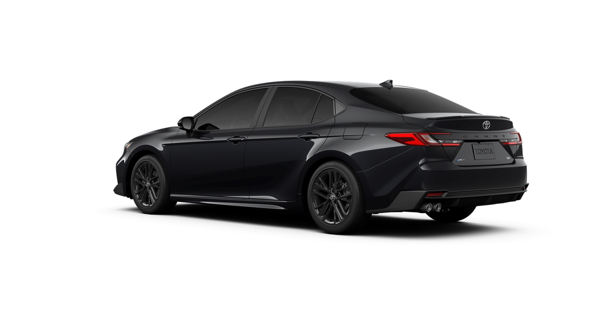 Midnight Black 2026 Toyota Camry SE FWD eCVT 2.5L 4-Cylinder 16V DOHC 4-Wheel Disc Brakes, 6 Speakers, ABS brakes, Air Conditioning, Alloy wheels, AM/FM radio: SiriusXM, Apple CarPlay/Android Auto, Auto High-beam Headlights, Automatic temperature control, Brake assist, Bumpers: body-color, Delay-off headlights, Driver door bin, Driver vanity mirror, Dual front impact airbags, Dual front side impact airbags, Electronic Stability Control, Emergency communication system: Safety Connect (5-year trial), Exterior Parking Camera Rear, Four wheel independent suspension, Front anti-roll bar, Front Bucket Seats, Front Center Armrest, Front dual zone A/C, Front reading lights, Front Seats, Fully automatic headlights, Heated door mirrors, Heated Front Seats, Illuminated entry, Knee airbag, Leather Shift Knob, Leather steering wheel, Low tire pressure warning, Occupant sensing airbag, Outside temperature display, Overhead airbag, Overhead console, Panic alarm, Passenger door bin, Passenger vanity mirror, Power door mirrors, Power driver seat, Power steering, Power windows, Radio data system, Radio: 12.3 Toyota Multimedia Audio, Radio: 8 Toyota Audio Multimedia, Rear anti-roll bar, Rear reading lights, Rear seat center armrest, Rear window defroster, Remote keyless entry, Security system, SofTex and Fabric Seat Trim, Speed control, Speed-sensing steering, Split folding rear seat, Spoiler, Steering wheel mounted audio controls, Telescoping steering wheel, Tilt steering wheel, Traction control, Trip computer, Turn signal indicator mirrors, Variably intermittent wipers, and Wheels: 18 Multi-Spoke Black-Finished Alloy.
