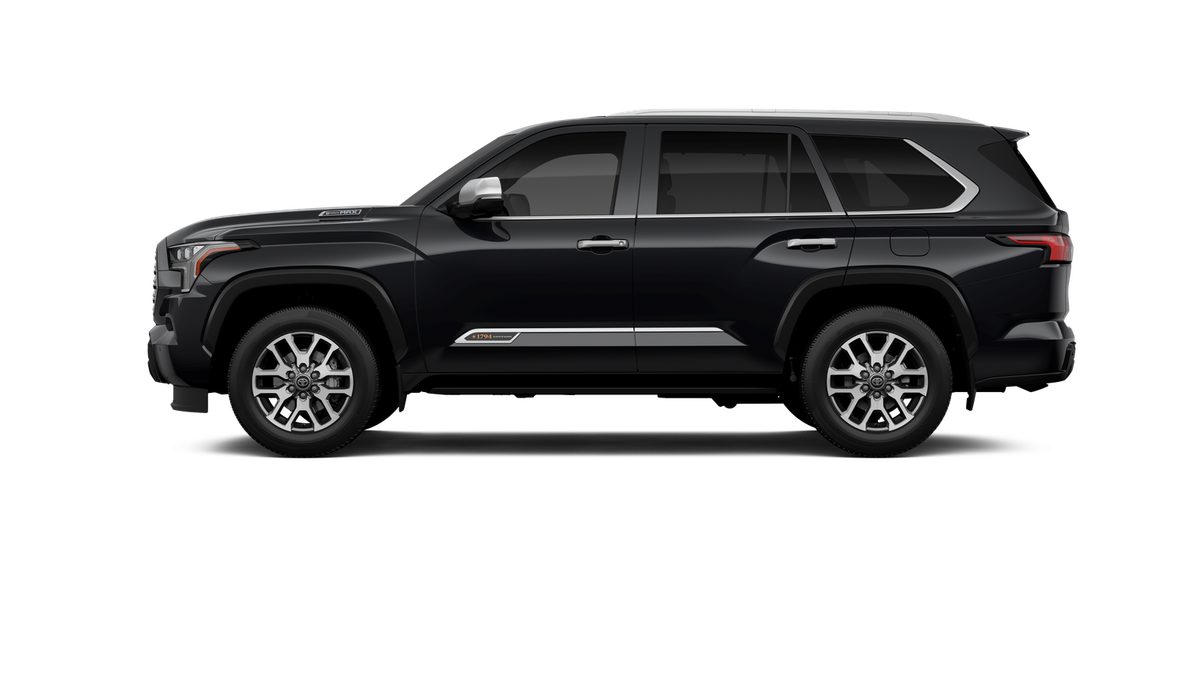 Midnight Black 2026 Toyota Sequoia 1794 Edition 4WD 10-Speed Automatic V6 Hybrid 14 Speakers, 20 Alloy Wheels, 3rd row seats: split-bench, 4-Wheel Disc Brakes, ABS brakes, Air Conditioning, Alloy wheels, AM/FM radio: SiriusXM, Anti-whiplash front head restraints, Apple CarPlay/Android Auto, Auto High-beam Headlights, Auto tilt-away steering wheel, Auto-dimming door mirrors, Auto-dimming Rear-View mirror, Automatic temperature control, Brake assist, Bumpers: body-color, Compass, Delay-off headlights, Driver door bin, Driver vanity mirror, Dual front impact airbags, Dual front side impact airbags, Electronic Stability Control, Emergency communication system: Safety Connect (10-year trial), Exterior Parking Camera Rear, Front anti-roll bar, Front Bucket Seats, Front Center Armrest w/Storage, Front dual zone A/C, Front fog lights, Front reading lights, Front wheel independent suspension, Fully automatic headlights, Garage door transmitter: HomeLink, Genuine wood door panel insert, Headlight cleaning, Heated and Ventilated Front Seats, Heated door mirrors, Heated front seats, Heated rear seats, Heated steering wheel, Illuminated entry, Knee airbag, Leather Shift Knob, Leather steering wheel, Low tire pressure warning, Memory seat, Navigation system: Drive Connect (1 year trial) includes Cloud Navigation with real time traffic and Google POI, Occupant sensing airbag, Outside temperature display, Overhead airbag, Overhead console, Panic alarm, Passenger door bin, Passenger vanity mirror, Power door mirrors, Power driver seat, Power Liftgate, Power moonroof, Power passenger seat, Power steering, Power windows, Premium audio system: JBL, Premium Leather Seat Trim, Radio: 14 Toyota Audio Multimedia with JBL Premium Audio, Rain sensing wipers, Rear air conditioning, Rear reading lights, Rear seat center armrest, Rear window defroster, Rear window wiper, Reclining 3rd row seat, Remote keyless entry, Security system, Speed control, Speed-sensing steering, Split folding rear seat, Spoiler, Sport steering wheel, Steering wheel mounted audio controls, Tachometer, Telescoping steering wheel, Tilt steering wheel, Traction control, Trip computer, Turn signal indicator mirrors, Variably intermittent wipers, Ventilated front seats, Ventilated rear seats, and Voltmeter.