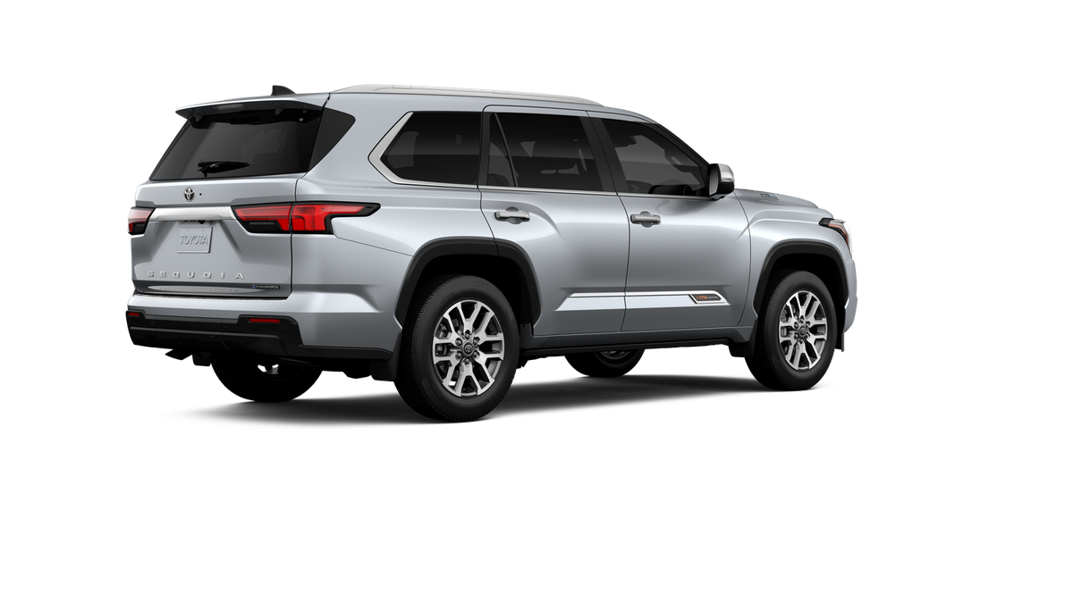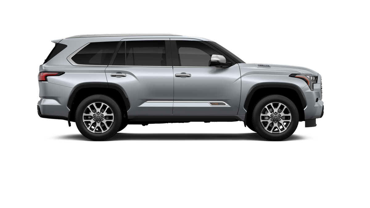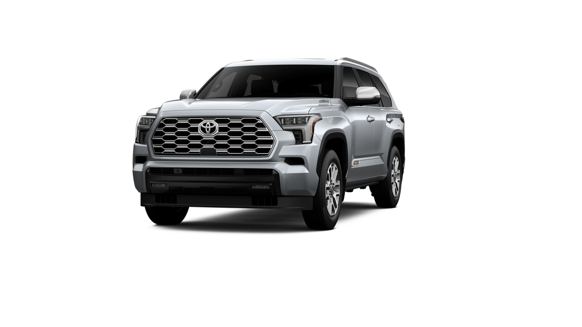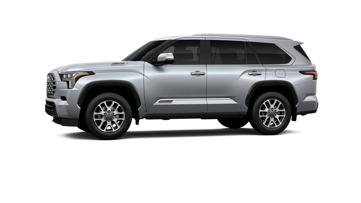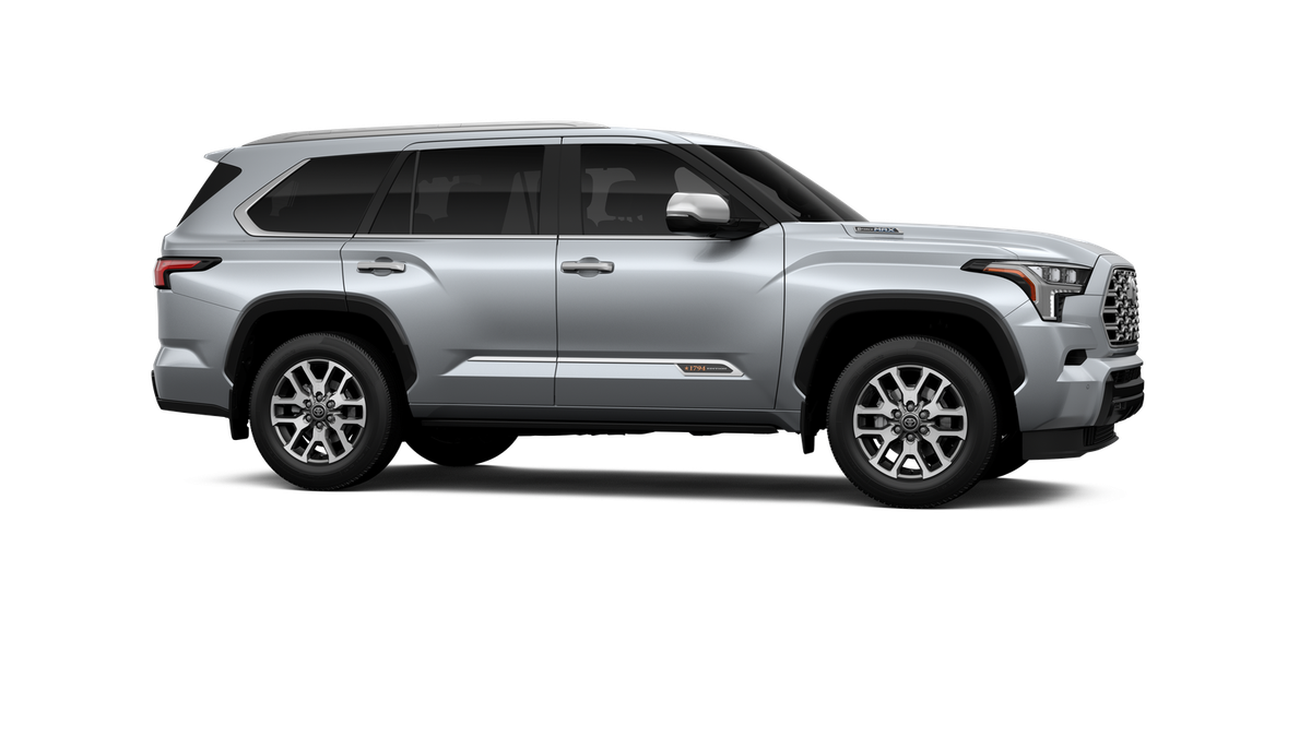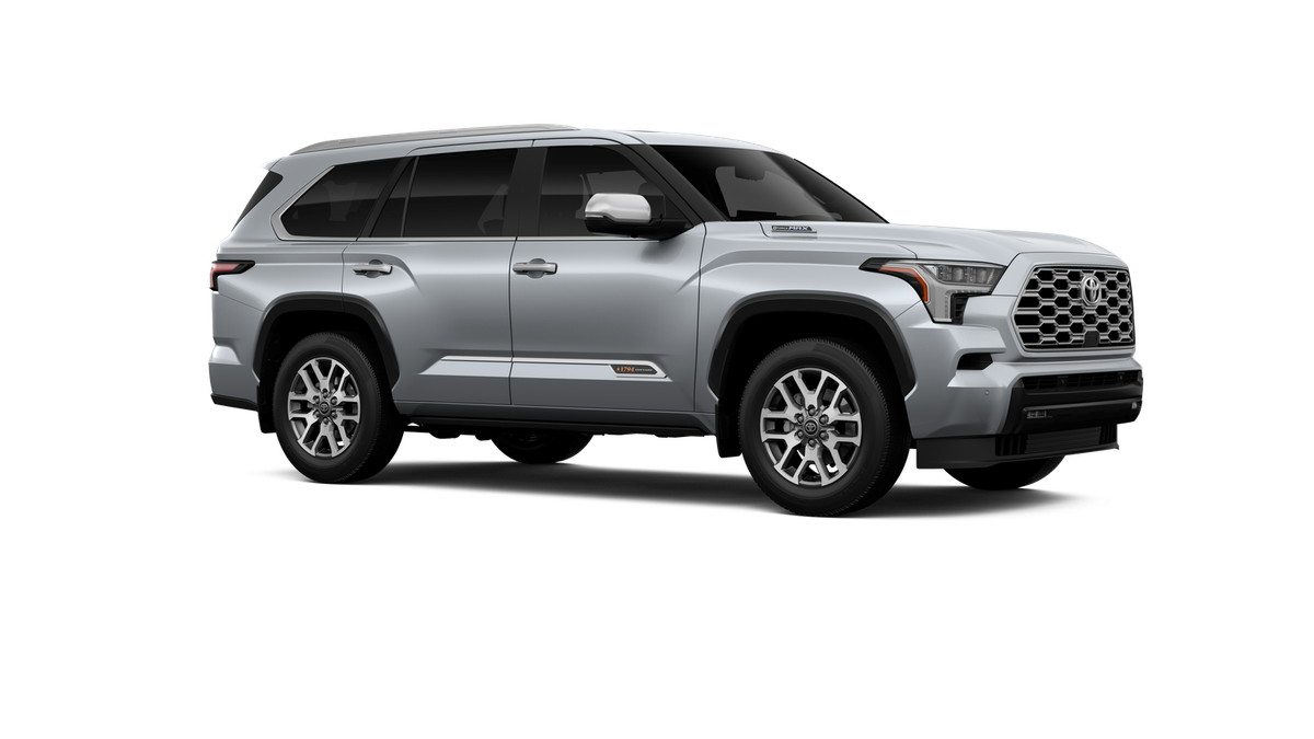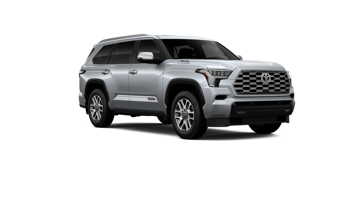 Silver 2026 Toyota Sequoia 1794 Edition 4WD 10-Speed Automatic V6 Hybrid 14 Speakers, 20 Alloy Wheels, 3rd row seats: split-bench, 4-Wheel Disc Brakes, ABS brakes, Air Conditioning, Alloy wheels, AM/FM radio: SiriusXM, Anti-whiplash front head restraints, Apple CarPlay/Android Auto, Auto High-beam Headlights, Auto tilt-away steering wheel, Auto-dimming door mirrors, Auto-dimming Rear-View mirror, Automatic temperature control, Brake assist, Bumpers: body-color, Compass, Delay-off headlights, Driver door bin, Driver vanity mirror, Dual front impact airbags, Dual front side impact airbags, Electronic Stability Control, Emergency communication system: Safety Connect (10-year trial), Exterior Parking Camera Rear, Front anti-roll bar, Front Bucket Seats, Front Center Armrest w/Storage, Front dual zone A/C, Front fog lights, Front reading lights, Front wheel independent suspension, Fully automatic headlights, Garage door transmitter: HomeLink, Genuine wood door panel insert, Headlight cleaning, Heated and Ventilated Front Seats, Heated door mirrors, Heated front seats, Heated rear seats, Heated steering wheel, Illuminated entry, Knee airbag, Leather Shift Knob, Leather steering wheel, Low tire pressure warning, Memory seat, Navigation system: Drive Connect (1 year trial) includes Cloud Navigation with real time traffic and Google POI, Occupant sensing airbag, Outside temperature display, Overhead airbag, Overhead console, Panic alarm, Passenger door bin, Passenger vanity mirror, Power door mirrors, Power driver seat, Power Liftgate, Power moonroof, Power passenger seat, Power steering, Power windows, Premium audio system: JBL, Premium Leather Seat Trim, Radio: 14 Toyota Audio Multimedia with JBL Premium Audio, Rain sensing wipers, Rear air conditioning, Rear reading lights, Rear seat center armrest, Rear window defroster, Rear window wiper, Reclining 3rd row seat, Remote keyless entry, Security system, Speed control, Speed-sensing steering, Split folding rear seat, Spoiler, Sport steering wheel, Steering wheel mounted audio controls, Tachometer, Telescoping steering wheel, Tilt steering wheel, Traction control, Trip computer, Turn signal indicator mirrors, Variably intermittent wipers, Ventilated front seats, Ventilated rear seats, and Voltmeter.