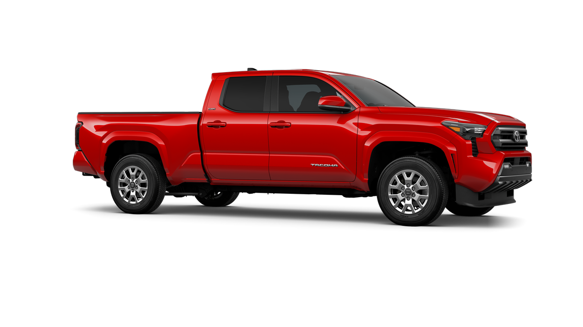 Red 2026 Toyota Tacoma SR5 4WD 8-Speed Automatic 2.4L 4-Cylinder 3.583 Axle Ratio, 4-Wheel Disc Brakes, 6 Speakers, ABS brakes, Air Conditioning, Alloy wheels, AM/FM radio: SiriusXM, Anti-whiplash front head restraints, Apple CarPlay/Android Auto, Auto High-beam Headlights, Auto-dimming Rear-View mirror, Brake assist, Bumpers: body-color, Driver door bin, Dual front impact airbags, Dual front side impact airbags, Electronic Stability Control, Emergency communication system: Safety Connect (up to 10-year trial subscription), Exterior Parking Camera Rear, Fabric Seat Trim, Four wheel independent suspension, Front anti-roll bar, Front Bucket Seats, Front Center Armrest, Front fog lights, Front reading lights, Fully automatic headlights, Heated door mirrors, Illuminated entry, JBL Premium Audio, Knee airbag, Low tire pressure warning, Occupant sensing airbag, Outside temperature display, Overhead airbag, Overhead console, Panic alarm, Passenger door bin, Power door mirrors, Power steering, Power windows, Radio: 8 Toyota Audio Multimedia, Rear step bumper, Rear window defroster, Remote keyless entry, Speed control, Speed-sensing steering, Split folding rear seat, Steering wheel mounted audio controls, Tachometer, Telescoping steering wheel, Tilt steering wheel, Traction control, Trip computer, Variably intermittent wipers, and Wheels: 17 Styled Alloy.