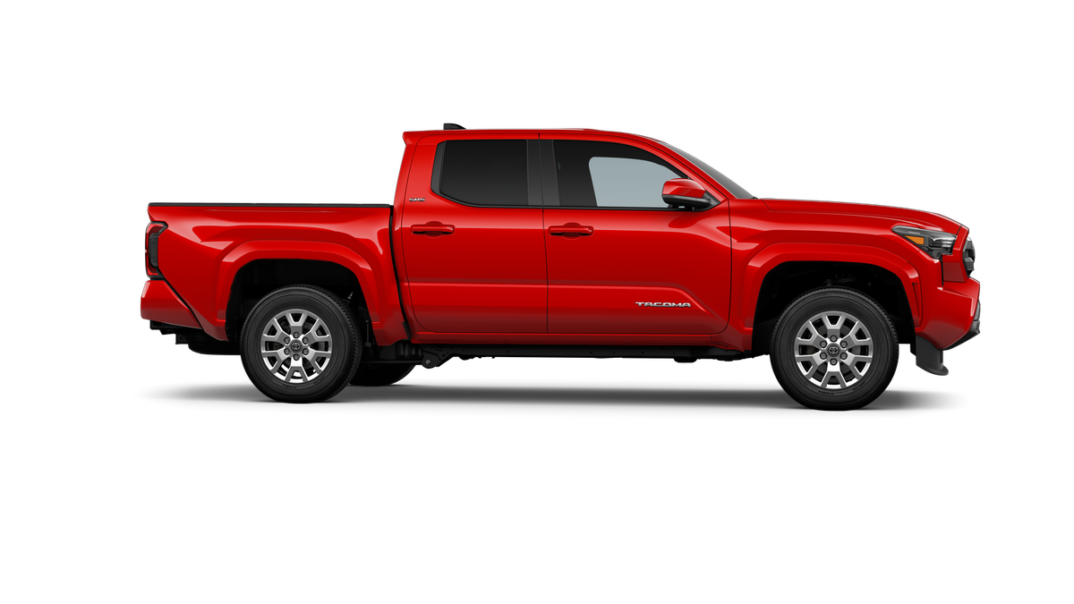 Red 2026 Toyota Tacoma SR5 4WD 8-Speed Automatic 2.4L 4-Cylinder 3.583 Axle Ratio, 4-Wheel Disc Brakes, 6 Speakers, ABS brakes, Air Conditioning, Alloy wheels, AM/FM radio: SiriusXM, Anti-whiplash front head restraints, Apple CarPlay/Android Auto, Auto High-beam Headlights, Auto-dimming Rear-View mirror, Body Side Molding, Brake assist, Bumpers: body-color, Driver door bin, Dual front impact airbags, Dual front side impact airbags, Electronic Stability Control, Emergency communication system: Safety Connect (up to 10-year trial subscription), Exterior Parking Camera Rear, Fabric Seat Trim, Four wheel independent suspension, Front anti-roll bar, Front Bucket Seats, Front Center Armrest, Front fog lights, Front reading lights, Fully automatic headlights, Heated door mirrors, Illuminated entry, JBL Premium Audio, Knee airbag, Low tire pressure warning, Occupant sensing airbag, Outside temperature display, Overhead airbag, Overhead console, Panic alarm, Passenger door bin, Power door mirrors, Power steering, Power windows, Radio: 8 Toyota Audio Multimedia, Rear step bumper, Rear window defroster, Remote keyless entry, Speed control, Speed-sensing steering, Split folding rear seat, Spray-on Bed Liner, Steering wheel mounted audio controls, Tachometer, Telescoping steering wheel, Tilt steering wheel, Traction control, Trip computer, Variably intermittent wipers, and Wheels: 17 Styled Alloy.