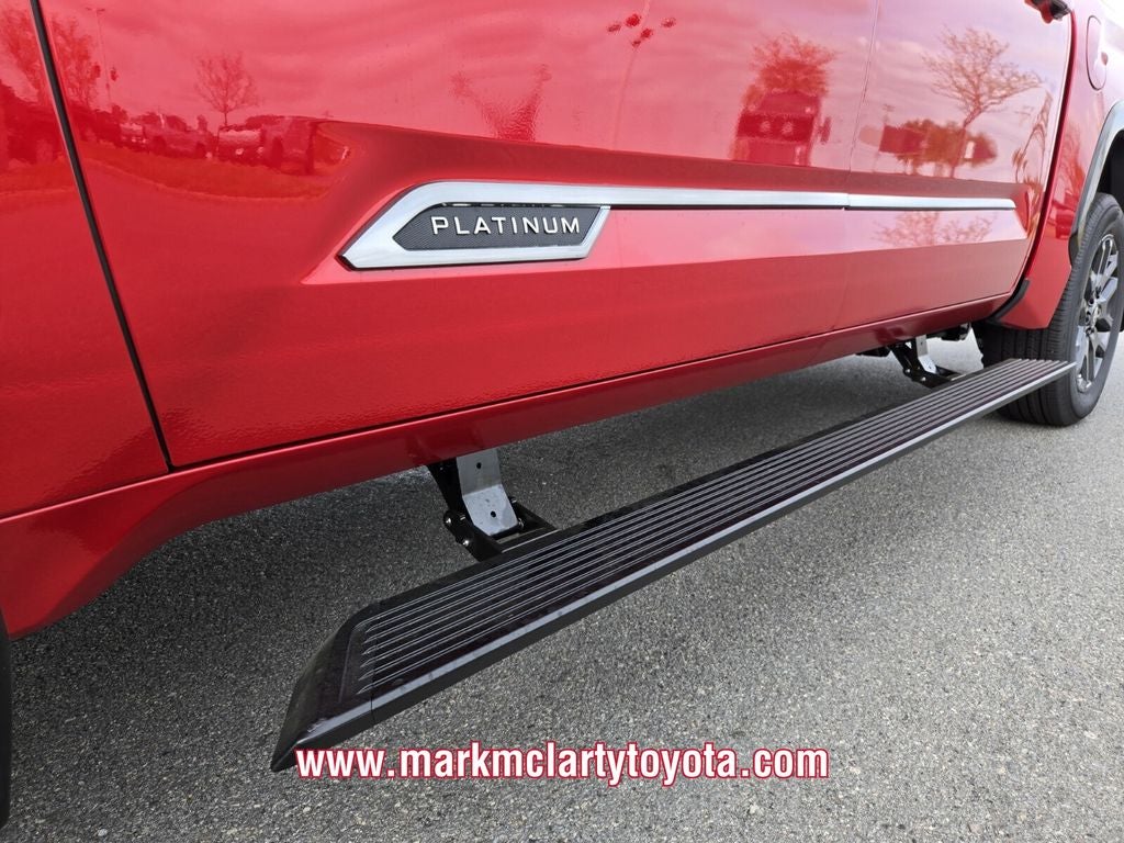 Red 2026 Toyota Tundra Platinum 4WD 10-Speed Automatic 3.4L V6 10-Way Power Adjustable Heated and Ventilated Front Seats, 12 Speakers, 3.31 Axle Ratio, 4-Wheel Disc Brakes, ABS brakes, Air Conditioning, Alloy wheels, AM/FM radio: SiriusXM, Apple CarPlay/Android Auto, Auto High-beam Headlights, Auto-dimming door mirrors, Auto-dimming Rear-View mirror, Automatic temperature control, Brake assist, Bumpers: body-color, Compass, Delay-off headlights, Driver door bin, Driver vanity mirror, Dual front impact airbags, Dual front side impact airbags, Electronic Stability Control, Emergency communication system: Safety Connect (up to 10-year trial subscription), Exterior Parking Camera Rear, Front anti-roll bar, Front Bucket Seats, Front Center Armrest, Front dual zone A/C, Front fog lights, Front reading lights, Front wheel independent suspension, Fully automatic headlights, Garage door transmitter: HomeLink, Heated door mirrors, Heated front seats, Heated rear seats, Heated steering wheel, Illuminated entry, Knee airbag, Leather Shift Knob, Leather steering wheel, Low tire pressure warning, Memory seat, Navigation system: Drive Connect Cloud Navigation (1-year trial subscription), Occupant sensing airbag, Outside temperature display, Overhead airbag, Overhead console, Panic alarm, Passenger door bin, Passenger vanity mirror, Power door mirrors, Power driver seat, Power moonroof, Power passenger seat, Power steering, Power windows, Premium Leather Seat Trim, Radio data system, Radio: Premium Audio, Rain sensing wipers, Rear reading lights, Rear seat center armrest, Rear step bumper, Rear window defroster, Remote keyless entry, Safety Connect, Security system, Speed control, Speed-sensing steering, Speed-Sensitive Wipers, Split folding rear seat, Steering wheel memory, Steering wheel mounted audio controls, Tachometer, Telescoping steering wheel, Tilt steering wheel, Traction control, Trip computer, Turn signal indicator mirrors, Variably intermittent wipers, Ventilated front seats, Ventilated rear seats, Voltmeter, and Wheels: 20 Dark Painted Alloy.