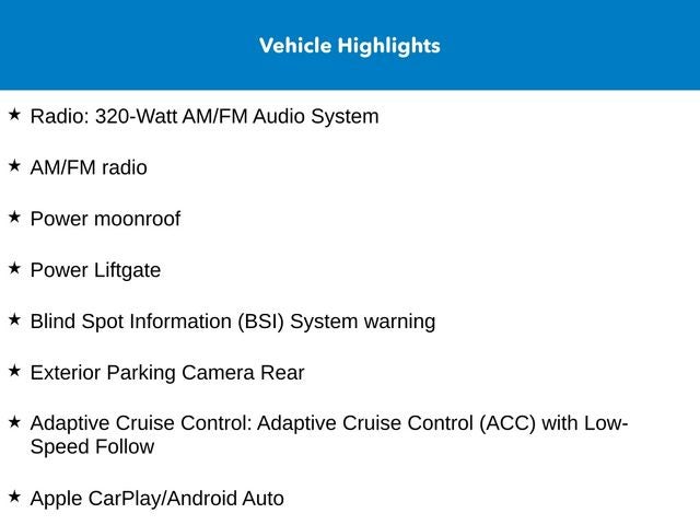 Indulge in the convenience of a power liftgate, the safety of a Blind Spot Information (BSI) System, and the seamless connectivity of Apple CarPlay and Android Auto. Pamper yourself with the comfort of heated front bucket seats and the luxury of leather seat trim. Enjoy the open-air freedom of the power moonroof, and let the 320-Watt AM/FM audio system serenade your journey.