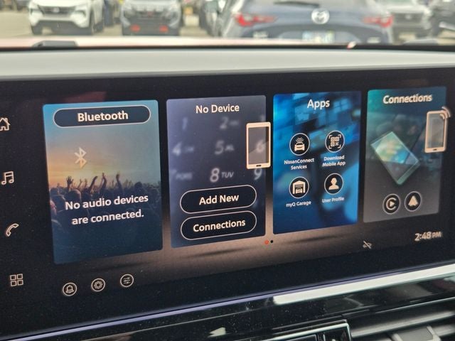 - Radio: AM/FM Audio System w/NissanConnect -inc: 6 speakers, 5G Wi-Fi hotspot, wireless Apple CarPlay and Android Auto, 12.3" center touch-screen display, SiriusXM satellite radio, 2 front USB connection (1 type C charge and data ports), Bluetooth® hands-free phone system, streaming audio and messaging and hands-free text messaging assistant