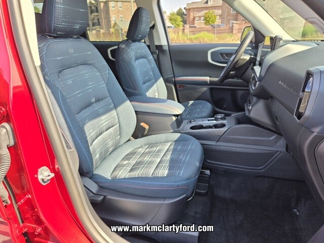Bronco Sport Heritage, 4D Sport Utility, 1.5L EcoBoost, 8-Speed Automatic, 4WD, Ruby Red Metallic, Navy Pier Cloth, 4-Wheel Disc Brakes, 6 Speakers, ABS brakes, Air Conditioning, Alloy wheels, AM/FM radio: SiriusXM, AM/FM Stereo, Auto High-beam Headlights, Automatic temperature control, Brake assist, Compass, Convenience Package, Delay-off headlights, Driver door bin, Driver vanity mirror, Dual front impact airbags, Dual front side impact airbags, Electronic Stability Control, Emergency communication system: SYNC 4 911 Assist, Equipment Group 250A, Four wheel independent suspension, Front anti-roll bar, Front Bucket Seats, Front Center Armrest, Front Driver/Passenger Seat Back Map Pockets, Front License Plate Bracket, Front reading lights, Fully automatic headlights, Heated 8-Way Power Driver's Seat, Heated door mirrors, Illuminated entry, Knee airbag, LED Fog Lamps, Low tire pressure warning, Occupant sensing airbag, Outside temperature display, Overhead airbag, Overhead console, Panic alarm, Passenger door bin, Passenger vanity mirror, Plaid Cloth Front Bucket Seats, Power door mirrors, Power Moonroof, Power steering, Power windows, Premium Wrapped Steering Wheel, Radio data system, Rear anti-roll bar, Rear Parking Sensors, Rear reading lights, Rear seat center armrest, Rear window defroster, Rear window wiper, Remote keyless entry, Security system, SiriusXM, Speed control, Speed-sensing steering, Speed-Sensitive Wipers, Split folding rear seat, Steering wheel mounted audio controls, SYNC 4 w/Enhanced Voice Recognition, Tachometer, Telescoping steering wheel, Tilt steering wheel, Traction control, Trip computer, Universal Garage Door Opener (UGDO), Variably intermittent wipers, Wheels: 17 Oxford White-Painted Aluminum.