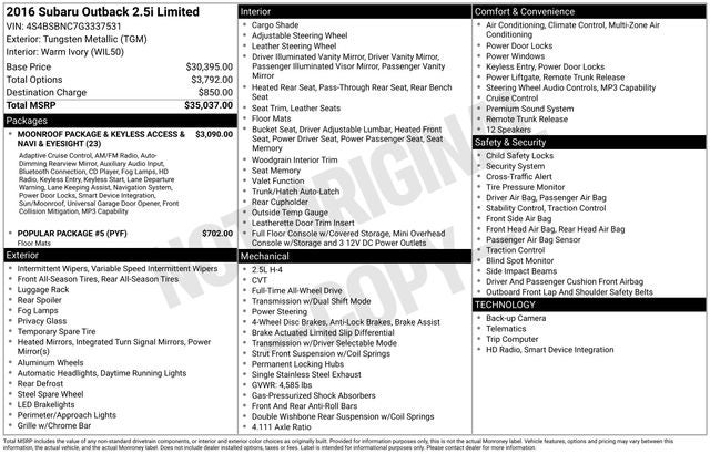 Tungsten Metallic 2016 Subaru Outback 2.5i 2.5L 4-Cylinder DOHC 16V CARFAX One-Owner. 25/33 City/Highway MPG