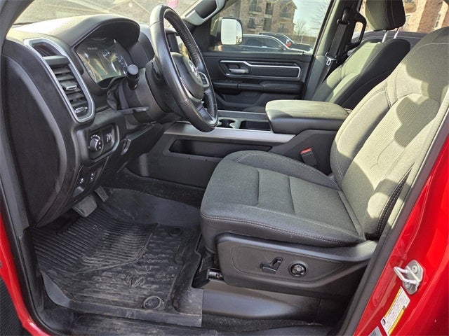 1500 Big Horn/Lone Star, 4D Crew Cab, HEMI 5.7L V8 Multi Displacement VVT, 8-Speed Automatic, 4WD, Flame Red Clearcoat, Black Cloth, 2nd Row In Floor Storage Bins, 3 Rear Seat Head Restraints, 4 Way Front Headrests, 4-Wheel Disc Brakes, 48V Belt Starter Generator, 6 Speakers, 9 Amplified Speakers w/Subwoofer, ABS brakes, Add Class IV Receiver Hitch, Air Conditioning, Alloy wheels, AM/FM radio, Anti-Spin Differential Rear Axle, Auto-Dimming Rear-View Mirror, Big Horn Badge, Big Horn IP Badge, Big Horn Level 1 Equipment Group, Black Interior Accents, Black Premium Power Mirrors, Black Trailer Tow Power Mirrors, Body Color Door Handles, Body Color Front Bumper, Body Color Premium Power Mirrors, Body Color Rear Bumper w/Step Pads, Brake assist, Bucket Seats, Bumpers: chrome, Class IV Receiver Hitch, Cloth Bench Seat, Cluster 3.5 TFT Color Display, Compass, Delay-off headlights, Deluxe Cloth Bucket Seats, Driver door bin, Dual front impact airbags, Dual front side impact airbags, Electronic Stability Control, Foam Bottle Insert (Door Trim Panel), Front & Rear Rubber Floor Mats, Front anti-roll bar, Front Center Armrest w/Storage, Front fog lights, Front reading lights, Front Seat Back Map Pockets, Front wheel independent suspension, Full Length Floor Console, Fully automatic headlights, Glove Box Lamp, GPS Antenna Input, Grille Surround 1 Body Color Texture 2 Black, Heated door mirrors, Illuminated entry, Leather steering wheel, Low tire pressure warning, Manual Adjust 4-Way Front Passenger Seat, Manufacturer's Statement of Origin, Occupant sensing airbag, Outside temperature display, Overhead airbag, Overhead console, Panic alarm, ParkView Rear Back-Up Camera, Passenger door bin, Passenger vanity mirror, Power 4-Way Driver Lumbar Adjust, Power 8-Way Driver Seat, Power Adjustable Pedals, Power door mirrors, Power steering, Power windows, Quick Order Package 27Z Big Horn, Radio data system, Radio: Uconnect 3 w/5 Display, Radio: Uconnect 4 w/8.4 Display, Rear 60/40 Folding Seat, Rear anti-roll bar, Rear Dome w/On/Off Switch Lamp, Rear Power Sliding Window, Rear seat center armrest, Rear step bumper, Rear Window Defroster, Remote keyless entry, Remote Start System, SiriusXM Satellite Radio, Speed control, Split folding rear seat, Sport Appearance Package, Sport Decal, Steering wheel mounted audio controls, Sun Visors w/Illuminated Vanity Mirrors, Tachometer, Telescoping steering wheel, Tilt steering wheel, Traction control, Trailer Brake Control, Trailer Tow Group, Trip computer, Universal Garage Door Opener, Variably intermittent wipers, Voltmeter, Wheels: 18 x 8 Cast-Aluminum Painted, Wheels: 20 x 9 Aluminum Chrome Clad (WRK).